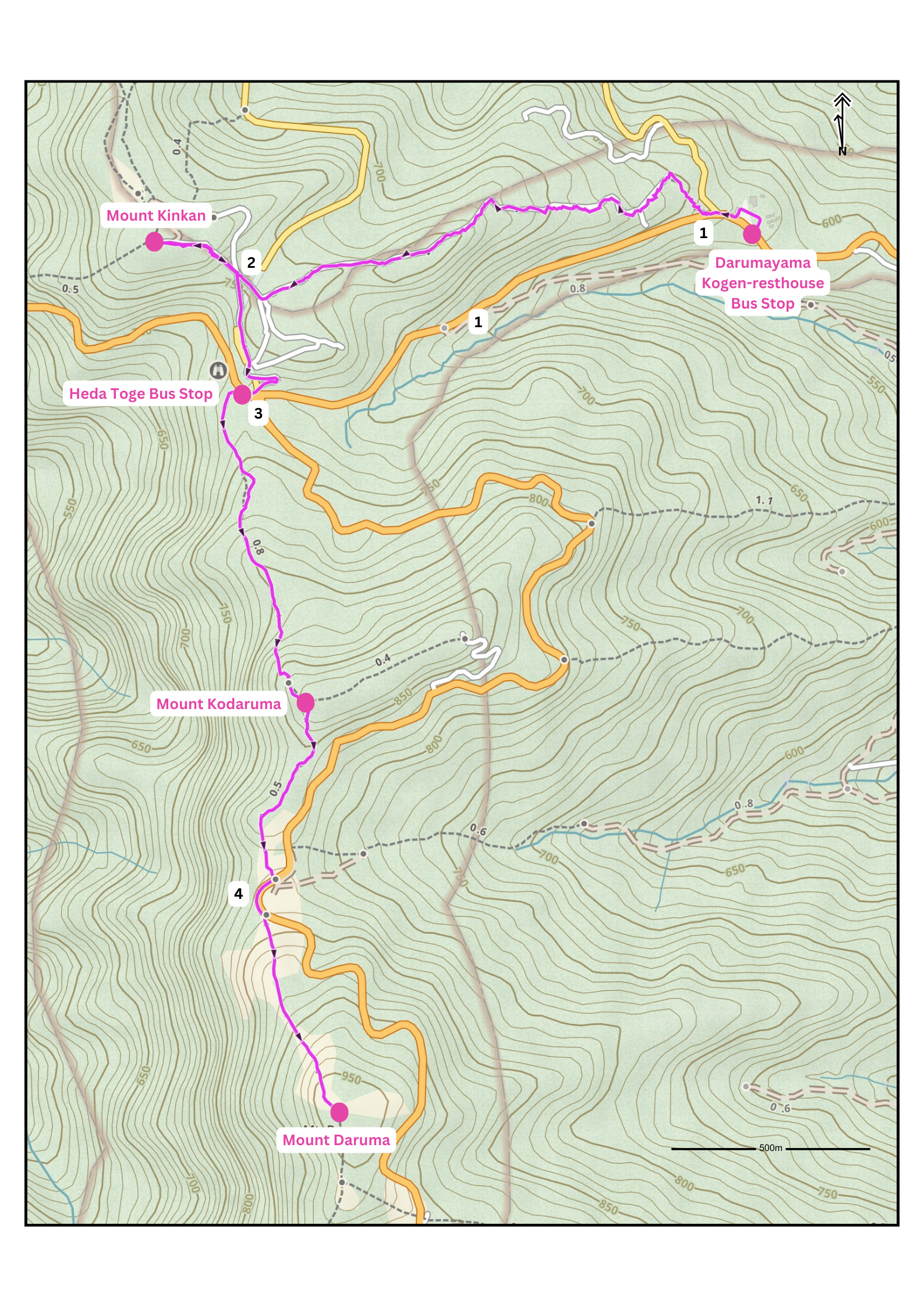 This is roughly a 4 hour hike but it can be shortened to two hours by starting and finishing at the Heda Toge Bus Stop (戸田峠) instead. You could also make it an A to B hike by starting at Fanabara Togeguchi Bus Stop (船原峠口) and walking over Mount Daruma and to the Heda Toge Bus Stop. But, info now told, let's stop there lest I make it even more confusing!